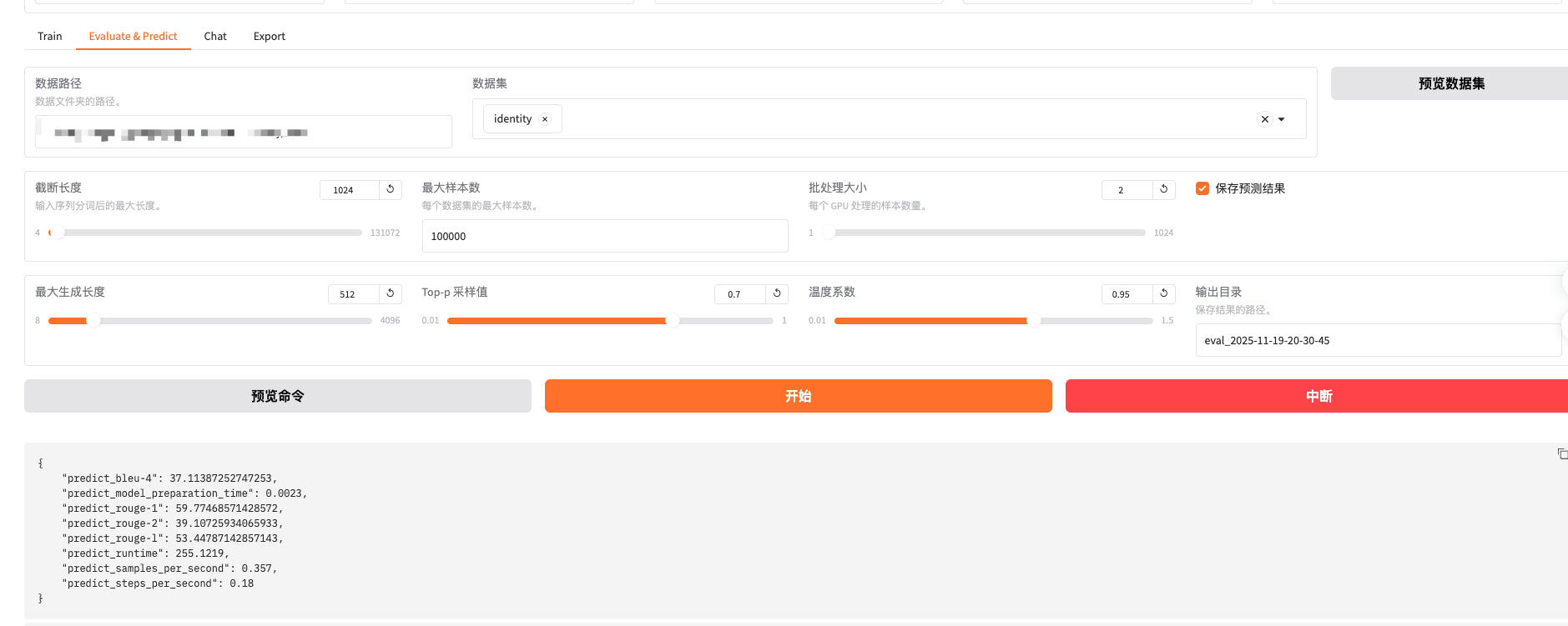 评估页面,还是以identity作为评测集(应该用单独的评测集),简单跑下5分钟后,生成基础的指标,比如bleu、rouge等效果指标和一些性能指标。只有基本指标,指标项较少。